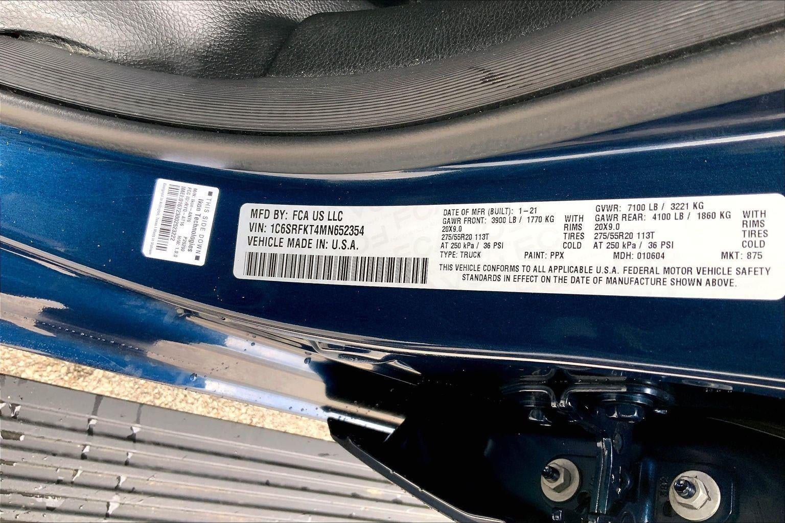 ENGINE: 5.7L V8 HEMI MDS VVT ETORQUE, TRANSMISSION: 8-SPEED AUTOMATIC (8HP75), QUICK ORDER PACKAGE 27K LONGHORN, 3.21 REAR AXLE RATIO, WHEELS: 20"" X 9"" ALUMINUM PAINTED/POLISHED, TIRES: 275/55R20 BSW ALL SEASON, MONOTONE PAINT, PATRIOT BLUE PEARLCOAT, BLACK/NEW SADDLE, LEATHER TRIMMED BUCKET SEATS, GVWR: 7,100 LBS, LONGHORN LEVEL 1 EQUIPMENT GROUP, TRAILER BRAKE CONTROL, 33 GALLON FUEL TANK, RADIO: UCONNECT 12 W/NAVIGATION, MANUFACTURER'S STATEMENT OF ORIGIN