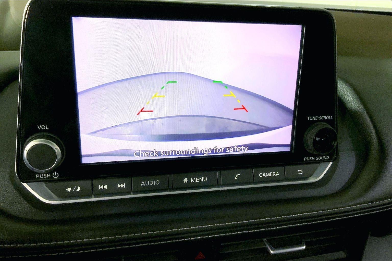 - The vehicle is equipped with a camera that displays an image of the area behind the vehicle on an interior display.