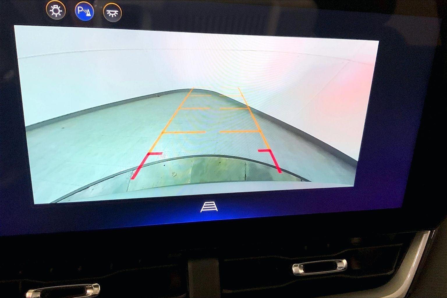 - The vehicle is equipped with a camera that displays an image of the area behind the vehicle on an interior display.