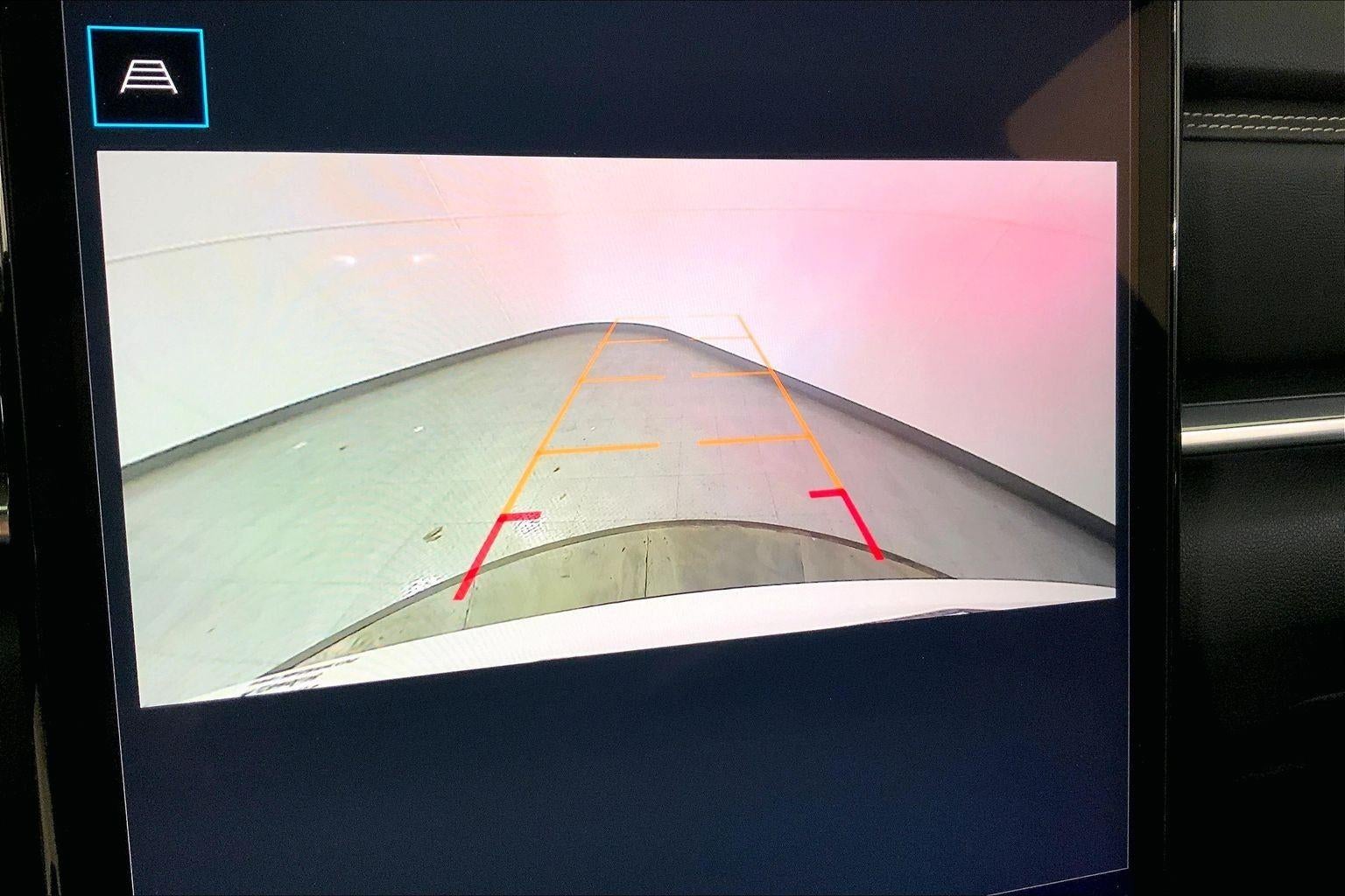 - The vehicle is equipped with a camera that displays an image of the area behind the vehicle on an interior display.