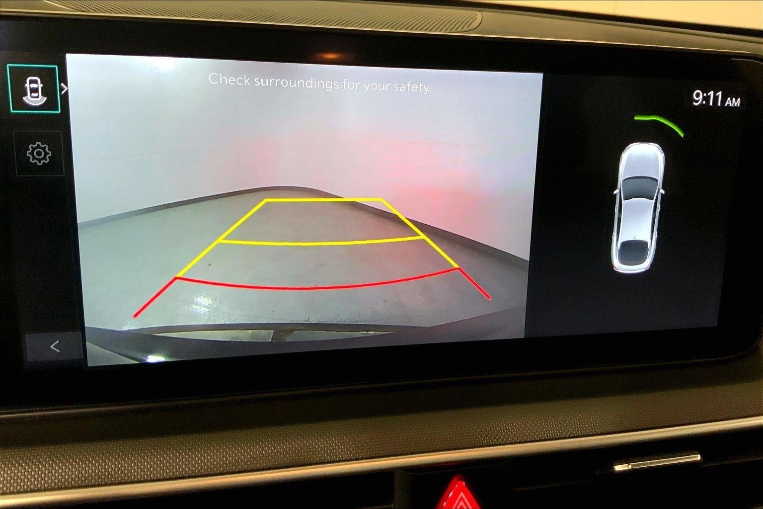 - The vehicle is equipped with a camera that displays an image of the area behind the vehicle on an interior display.
