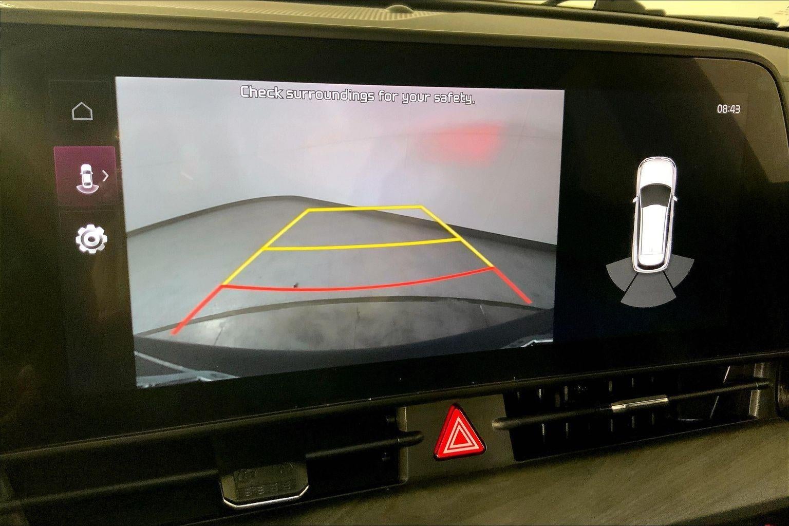 - The vehicle is equipped with a camera that displays an image of the area behind the vehicle on an interior display.